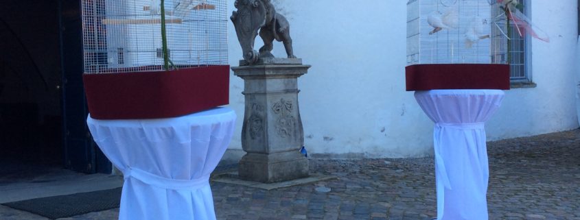 Heute um Punkt 15 Uhr begann unsere nördlichste Trauung in unserer Firmengeschichte. Das Wetter war uns wohl gesonnen und die Hochzeitsgesellschaft ging gut gelaunt in die Trauungszeremonie. Währenddessen verlegten wir draußen unseren roten Teppich der abgerundet wurde durch unsere edlen Pfauentauben, die links und rechts zu Beginn des Teppichs auf das Brautpaar warteten. Im Korb warteten unsere beflügelten Herzen auf ihren Einsatz.